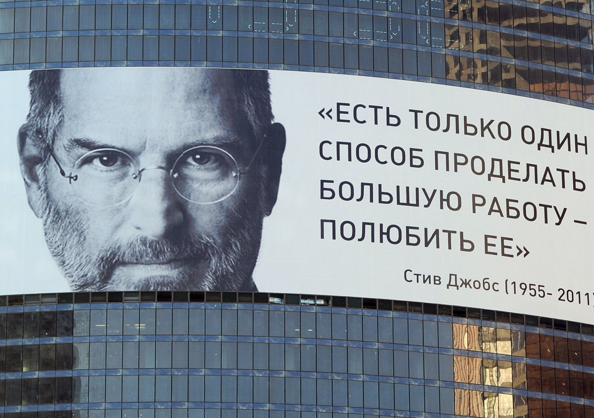 Плакат с портретом Стива Джобса на башне Федерация Московского международного делового центра Москва-Сити