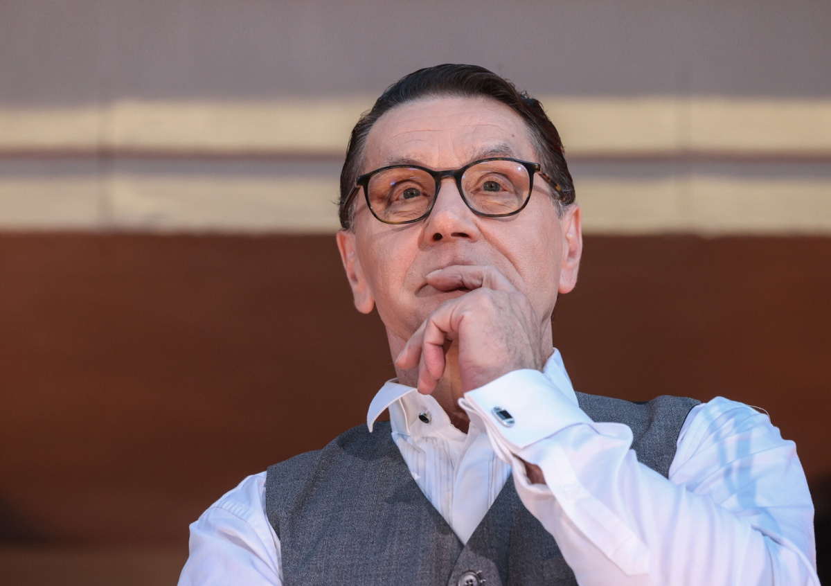 Актер Евгений Князев во время уличного концерта, посвященного закрытию 101-го сезона Государственного академического театра им. Евгения Вахтангова. Концерт посвящен 100-летию театра