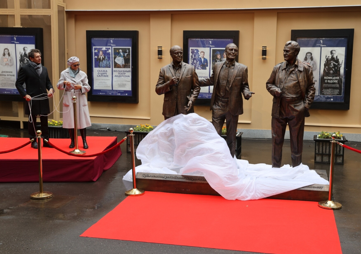 102-й сезон для вахтанговцев начался с исторического события. В Калошином переулке у Симоновской сцены торжественно открыли памятник трем значимым фигурам русского театра: вахтанговцам Владимиру Этушу, Василию Лановому и Юрию Яковлеву. Корифеи застыли в бронзе в непринужденной позе. Будто только вышли из театра и, улыбаясь прохожим, навсегда там и остались.