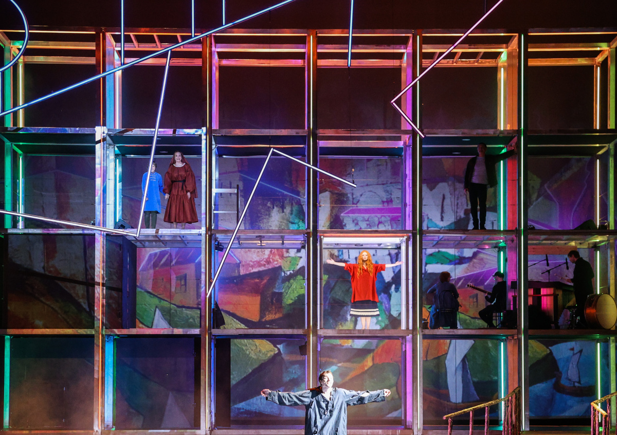 Сцена МХАТа стала трансформером: за одну минуту Белозерский монастырь с землянкой превращается в древний Псков с рекой Великой, по которой ходят юродивые, а уже через минуту конструкция становится хрущёвкой времён СССР.