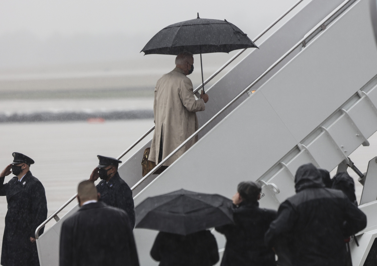 На кадрах, которые опубликовал Telegram-канал РИА Новости, видно, как Байден в дождливую погоду поднимается по трапу, примерно на полпути он задевает ботинком о ступеньку, но ему удаётся устоять несмотря на то, что в руках у него массивный зонт и дорожная сумка. После этого он благополучно преодолел оставшиеся ступеньки и скрылся в президентском самолёте.