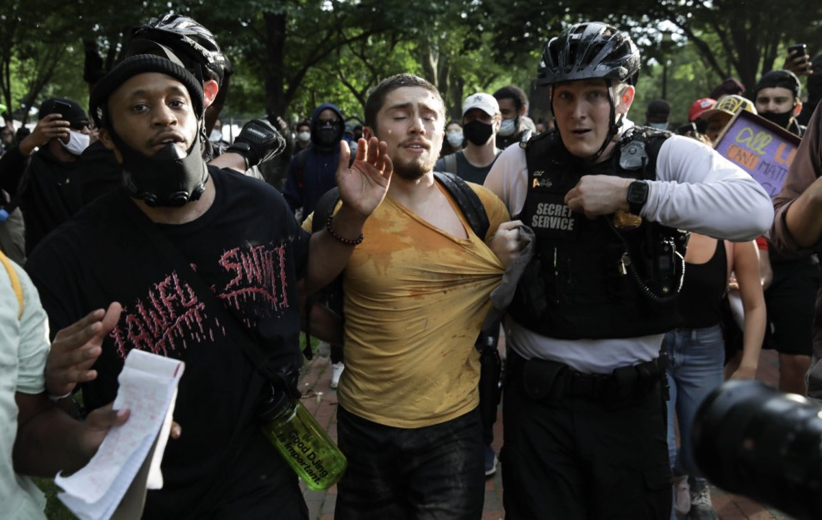 Правоохранительные органы перекрывали доступ к Белому дому из-за проходящей неподалёку от него, на площади Лафайет-сквер, акции протеста. Митинг состоялся в связи с гибелью афроамериканца Джорджа Флойда при полицейском задержании.