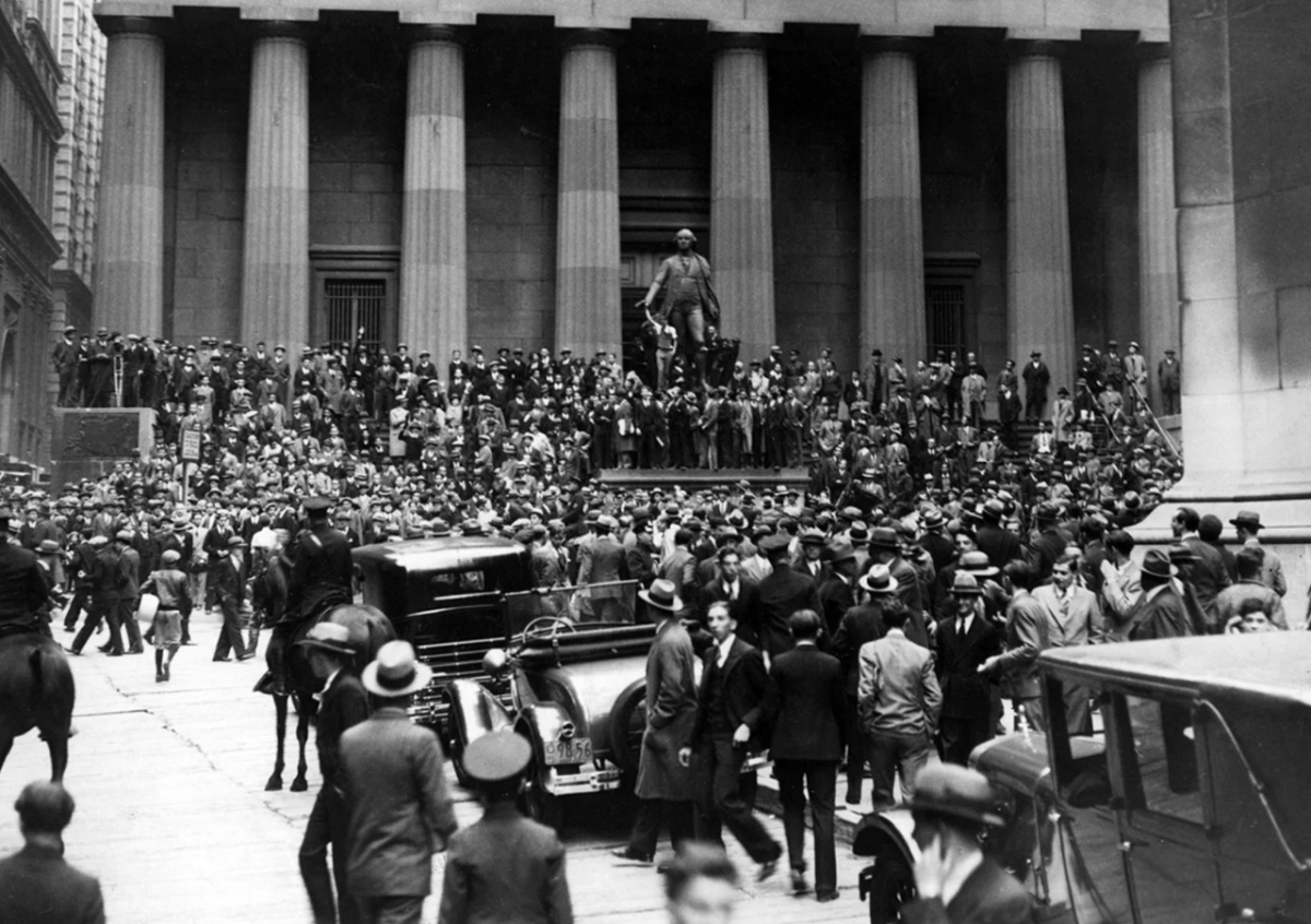 Толпы собираются у Нью-Йоркской фондовой биржи во время краха Уолл-стрит в 1929 году
