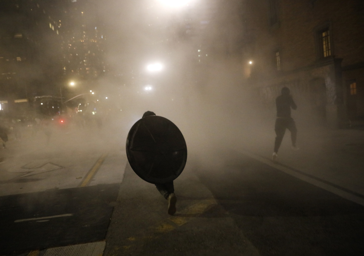В районе митинга горят, по меньшей мере, три здания, в том числе крупное отделение банка Wells Fargo и почта. Полицейские и Нацгвардия выставили заслоны из автомобилей и призывают людей разойтись, напоминая им, что противодействие правоохранительным органам противозаконно. В ответ митингующие забрасывают стражей правопорядка звуковыми петардами. Покинуть место проведения акции согласились только некоторые демонстранты.
