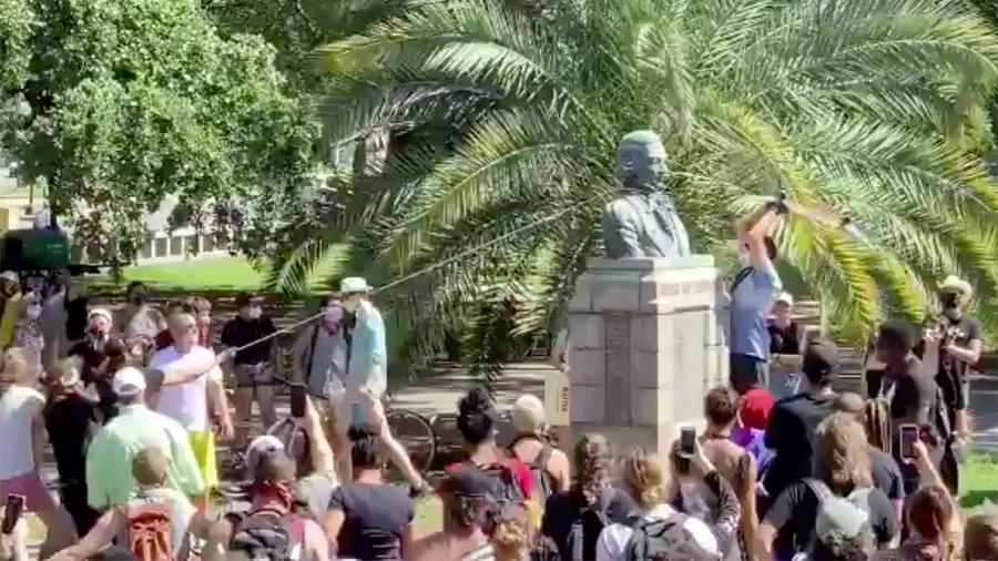Как сообщает телеканал Fox News, сначала протестующие снесли бюст, затем пронесли по улицам и погрузили на два автомобиля, на которых отвезли его к реке.