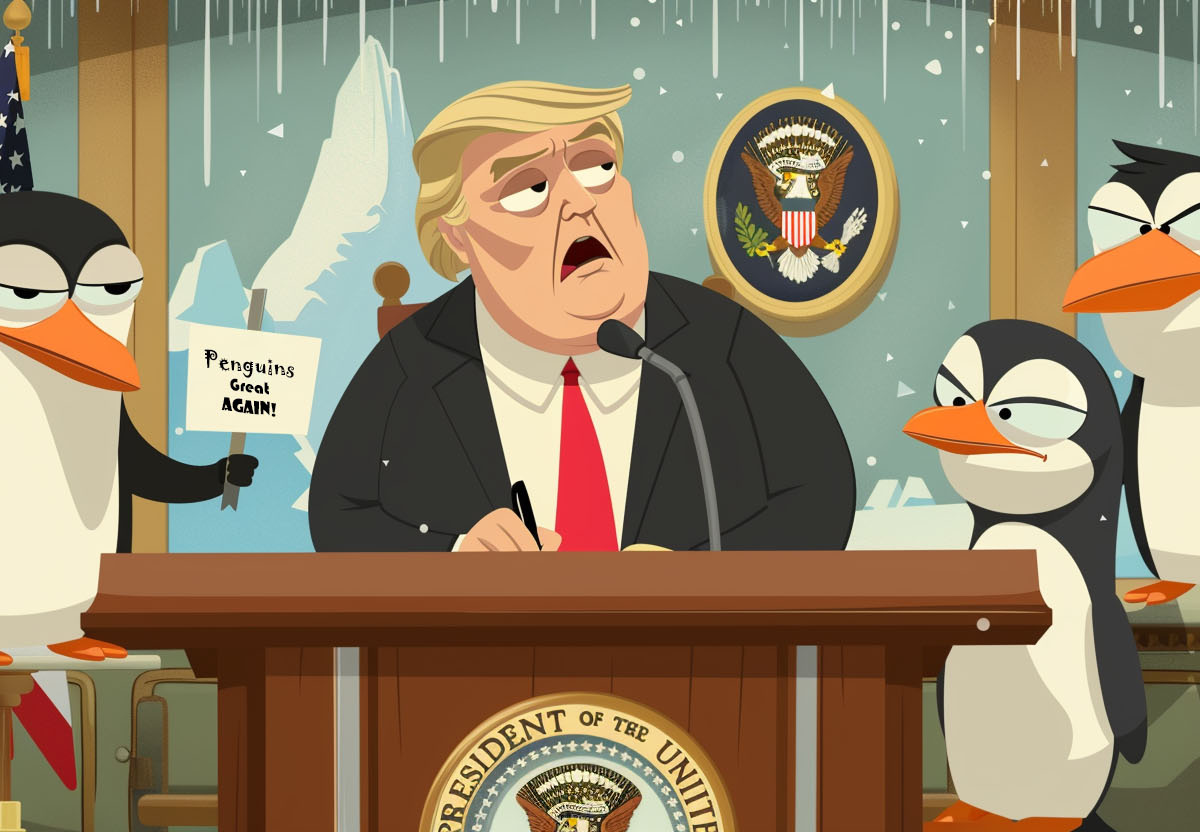 В соцсетях начали появляться мемы, созданные нейросетями забавные картинки и коллажи по поводу введения американским президентом Дональдом Трампом пошлин против необитаемых островов Херд и Макдональд, населенных лишь пингвинами и морскими птицами. На одной из таких картинок хозяина Белого дома изобразили отчитывающим пингвина в воде.