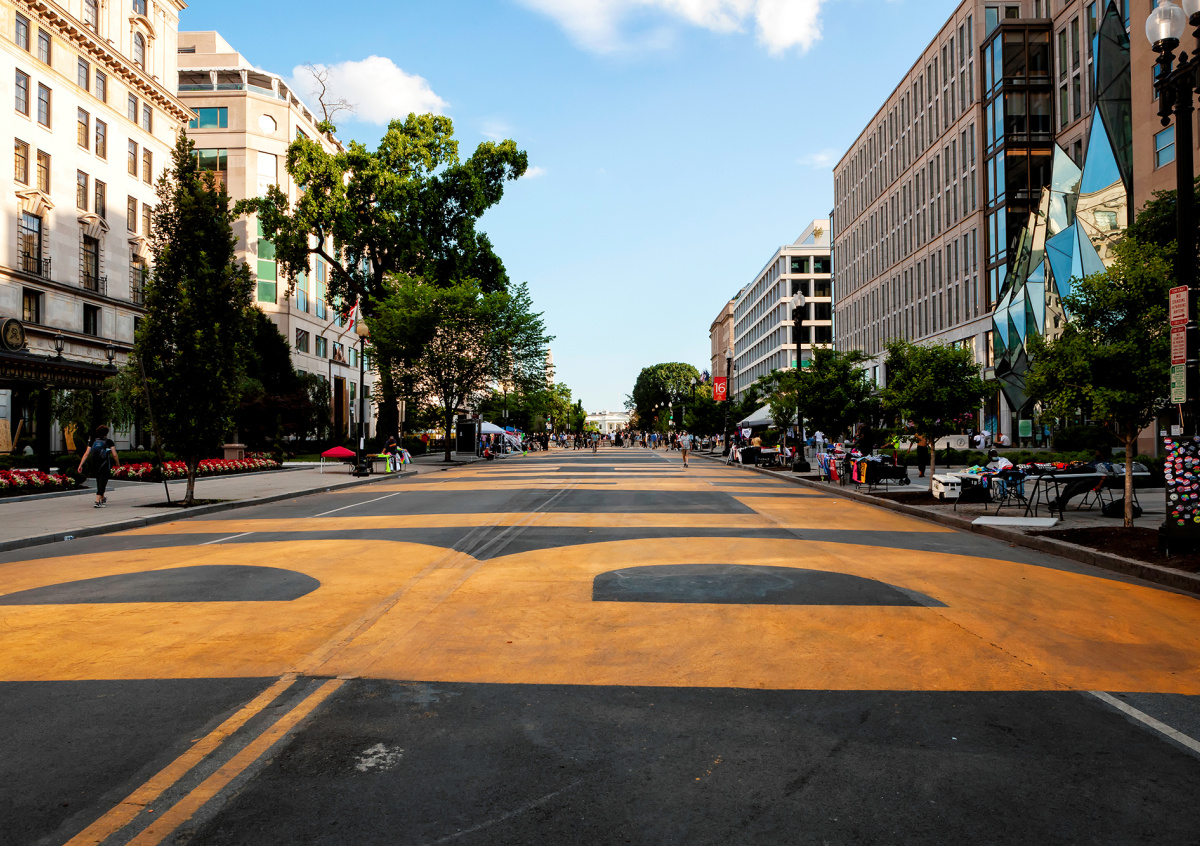 Мэр заказала соответствующую надпись на асфальте в июне 2020 года. Мурал занял два квартала ведущей к Белому дому улицы. Перекресток в центре города переименовали в Black Lives Matter Plaza. Такие решения городские власти приняли после массовых протестов, вызванных гибелью Джорджа Флойда во время задержания сотрудниками полиции в Миннеаполисе.