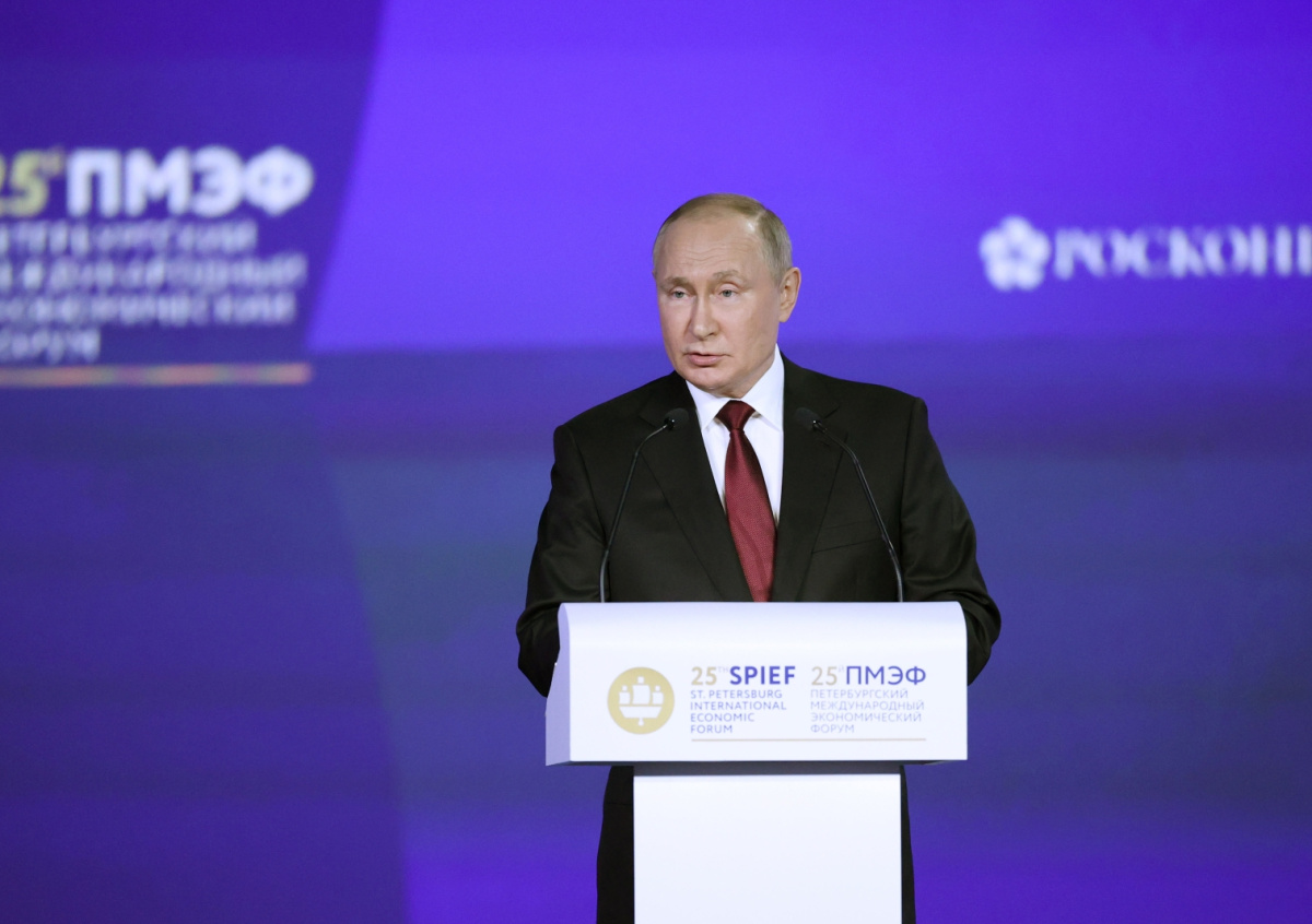 Президент РФ Владимир Путин во время выступления на пленарном заседании XXV Петербургского международного экономического форума Президент РФ Владимир Путин во время выступления на пленарном заседании XXV Петербургского международного экономического форума Фото: Сергей Бобылев/фотохост-агентство ТАСС