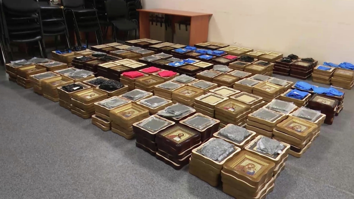 Федеральная служба безопасности показала кадры досмотра и изъятия икон с Украины, с которыми контрабандным путем пытались доставить в Россию взрывчатку. Из груза извлекли 27 самодельных взрывных устройств, 70 кг пластичного взрывчатого вещества повышенной мощности, 91 электродетонатор и части выстрела к РПГ-7. Взрывчатка была прикреплена к раме на обратной стороне икон.