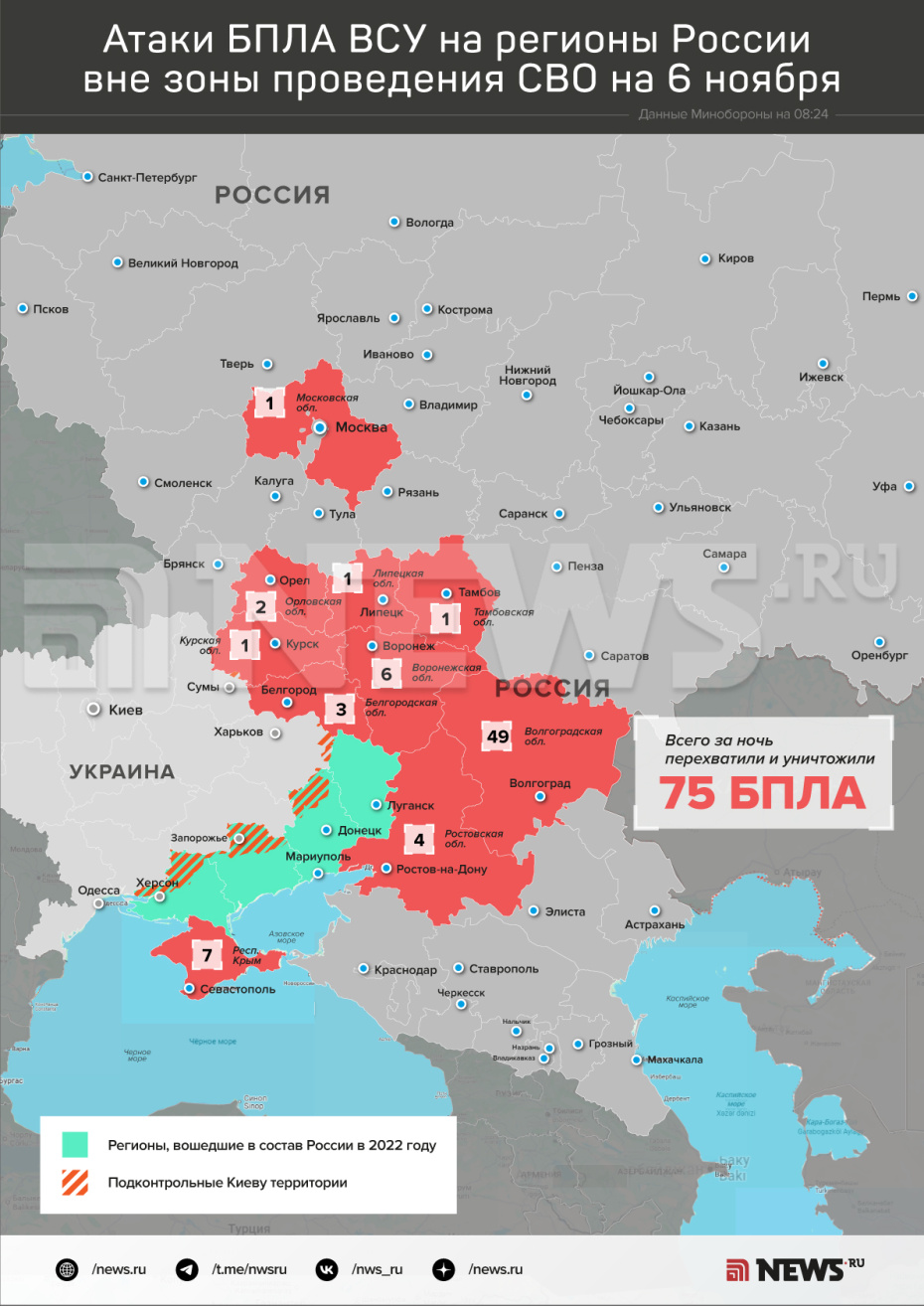 В течение прошедшей ночи дежурными средствами ПВО перехвачены и уничтожены 75 украинских беспилотных летательных аппаратов самолетного типа, — сказано в сообщении.