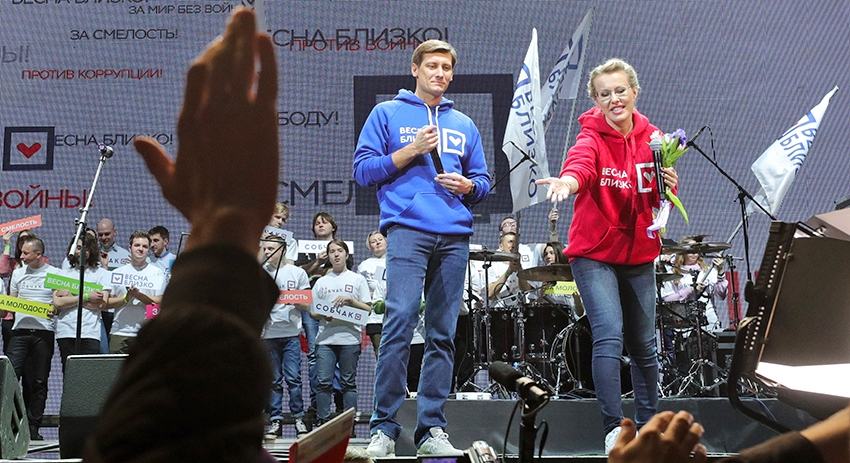 Политик Дмитрий Гудков и кандидат на пост президента РФ от партии «Гражданская инициатива» Ксения Собчак во время встречи с избирателями в клубе Adrenalin Stadium в преддверии выборов президента РФ Политик Дмитрий Гудков и кандидат на пост президента РФ от партии «Гражданская инициатива» Ксения Собчак во время встречи с избирателями в клубе Adrenalin Stadium в преддверии выборов президента РФ Фото: ТАСС/Сергей Бобылев