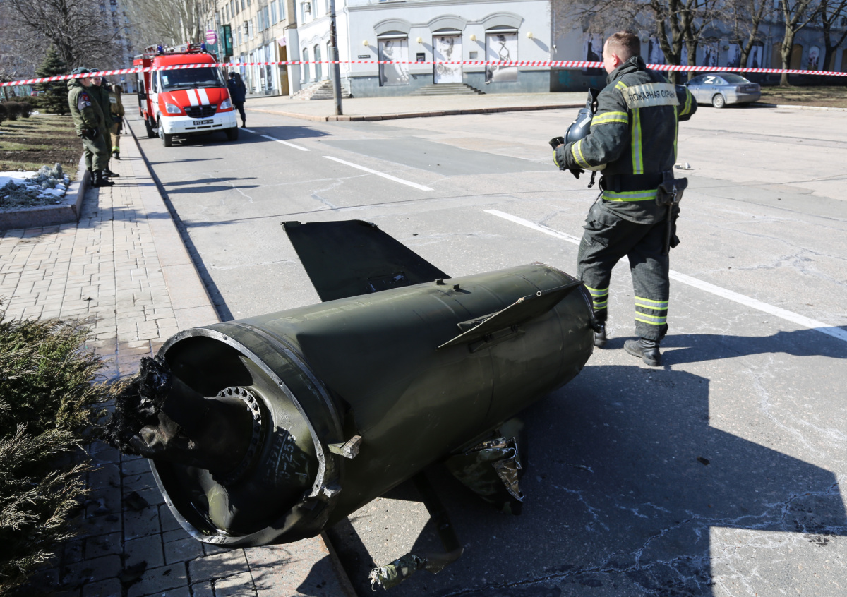 ДНР. Донецк. Сотрудник МЧС ДНР возле упавшей части сбитой ракеты «Точка-У» на бульваре Пушкина ДНР. Донецк. Сотрудник МЧС ДНР возле упавшей части сбитой ракеты «Точка-У» на бульваре Пушкина Фото: Валентин Спринчак/ТАСС