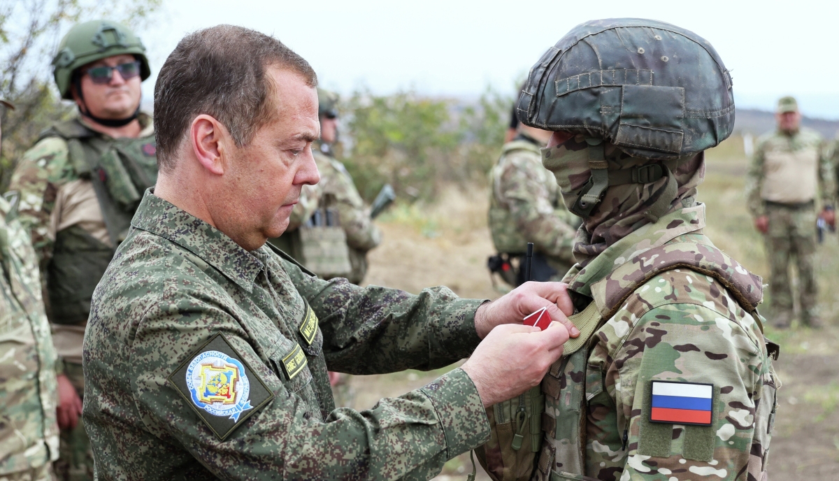 РИА Новости опубликовало фото Дмитрия Медведева во время поездки в ДНР. До этого сообщалось, что зампред Совбеза РФ побывал на линии боевого соприкосновения. На опубликованных фото видно, как Медведев награждает бойцов, цепляя на их одежду боевые награды и пожимая руку.