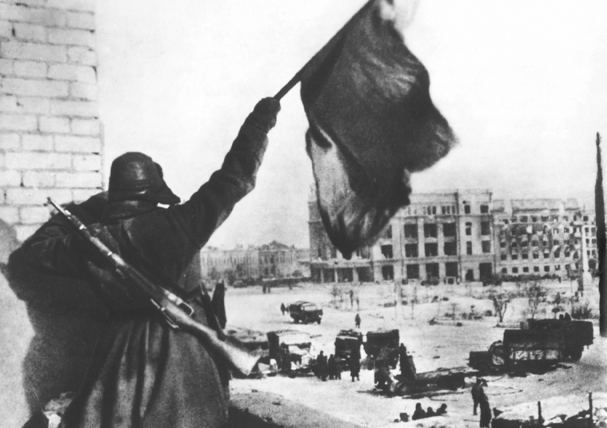 Cолдат Красной армии держит красный флаг над городом как символ победы Cолдат Красной армии держит красный флаг над городом как символ победы Фото: Scherl/Global Look Press