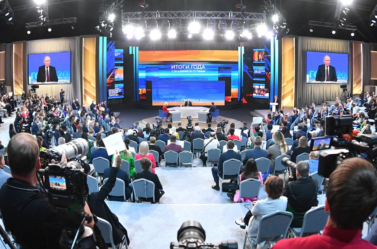 Прямая линия с главой государства началась в 12:00 по московскому времени 14 декабря. В 2023 году общение с гражданами и большая пресс-конференция с представителями СМИ проходят в совмещенном формате в Москве, в Гостином Дворе.