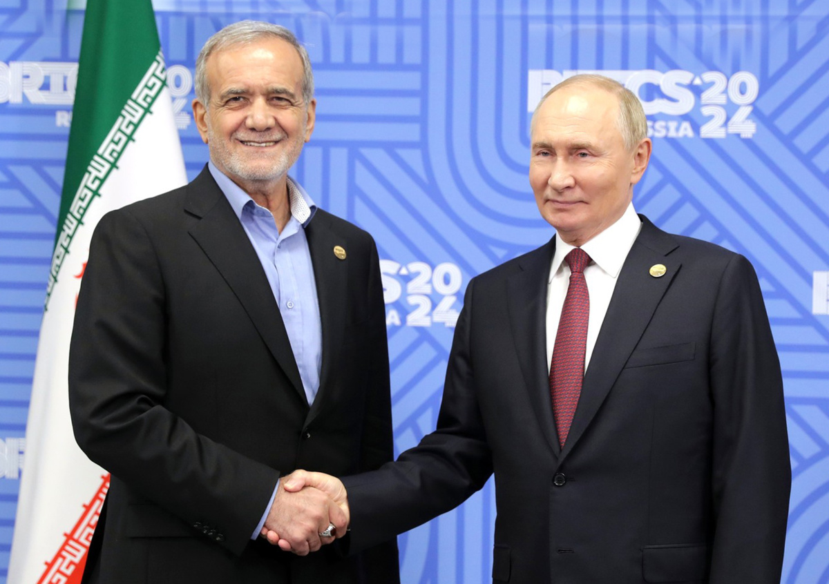 Владимир Путин и Масуд Пезешкиан Владимир Путин и Масуд Пезешкиан Фото: Анатолий Медведь/фотохост-агентство brics-russia2024.ru/kremlin.ru