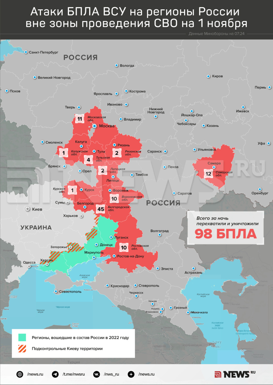 В течение прошедшей ночи в период с 23:00 мск 31 октября до 07:00 1 ноября дежурными средствами ПВО перехвачены и уничтожены 98 украинских беспилотных летательных аппаратов, — говорится в сообщении.