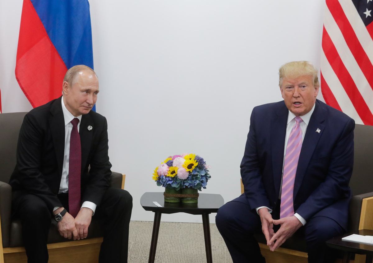 Президент России Владимир Путин и президент США Дональд Трамп (слева направо) во время встречи в рамках 14-го саммита лидеров стран Группы двадцати (G20) в международном выставочном комплексе INTEX Osaka Президент России Владимир Путин и президент США Дональд Трамп (слева направо) во время встречи в рамках 14-го саммита лидеров стран Группы двадцати (G20) в международном выставочном комплексе INTEX Osaka Фото: Михаил Метцель/ТАСС