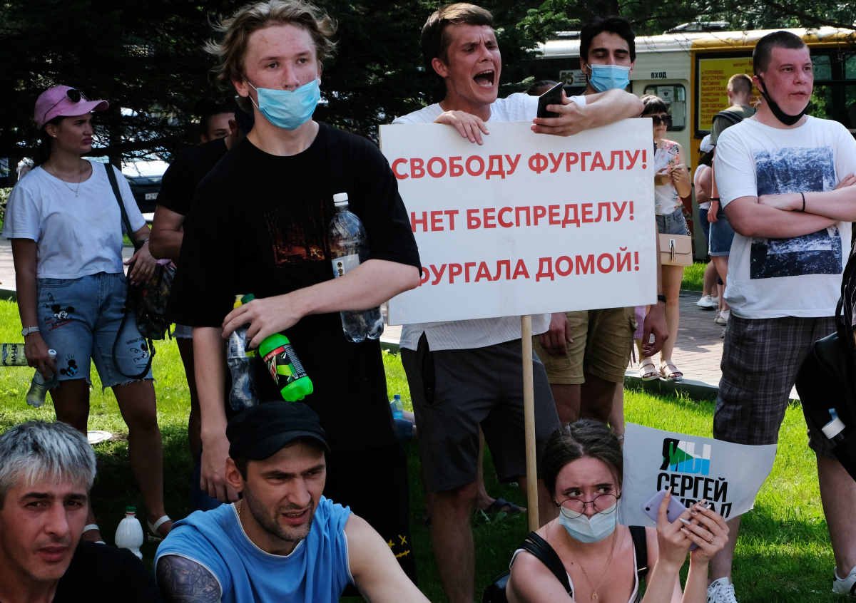 В Хабаровске митингующие снова вышли к зданию краевого правительства, скандируя лозунги в поддержку арестованного губернатора Сергея Фургала.