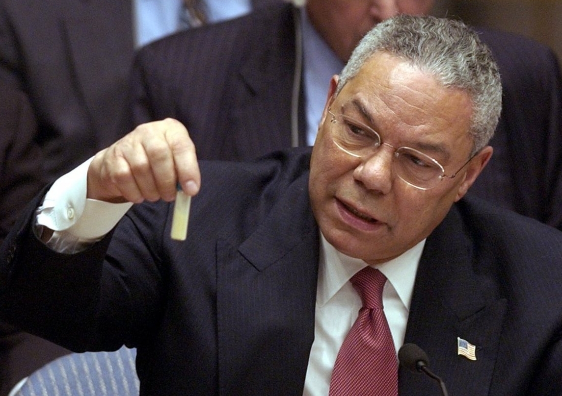 В 2003 году экс-госсекретарь сообщил, что получил информацию об имеющихся у лидера Ирака Саддама Хусейна технологиях производства биологического оружия, и продемонстрировал пробирку с белым порошком. После этого без санкции ООН началась операция США в Ираке. Впоследствии стало известно, что власти были дезинформированы специалистами ЦРУ. Сам Пауэлл утверждал, что показывал пробирку для убедительности.