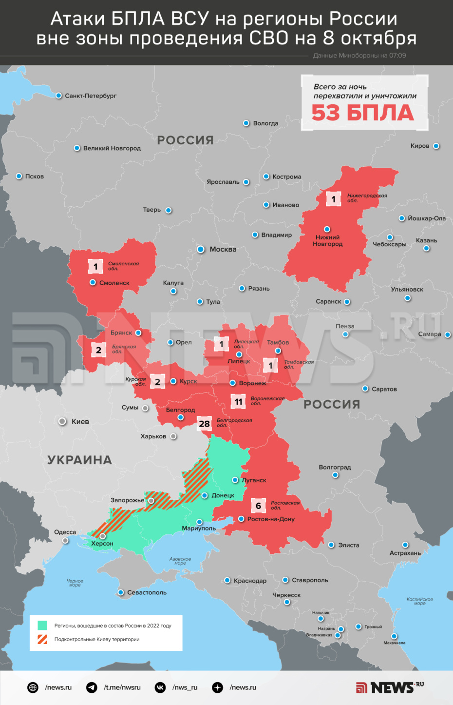 В течение прошедшей ночи в период с 23:00 7 октября текущего года до 07:00 мск 8 октября дежурными средствами ПВО перехвачены и уничтожены 53 украинских беспилотных летательных аппарата самолетного типа, — сказано в сообщении.