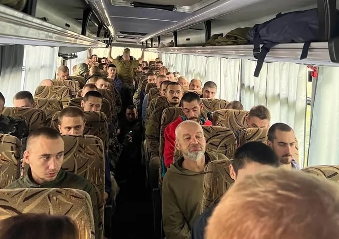 Журналистка Юлия Витязева опубликовала фотографию российских военных, возвращающихся в страну после нахождения в украинском плену. На кадре показаны несколько десятков военнослужащих в автобусе, следующем в сторону России.