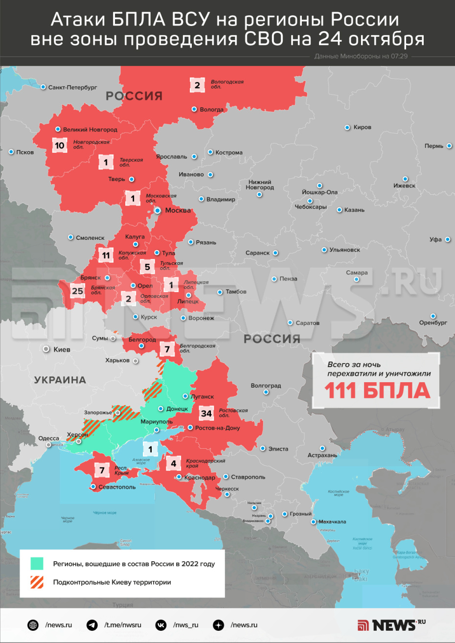 Ранее в Минобороны РФ отметили, что силы противовоздушной обороны в ночь на 23 октября уничтожили 139 беспилотников ВСУ в небе над Россией. Атаке с воздуха подверглись 11 регионов страны. Больше всего дронов было сбито над территорией Белгородской области (56).