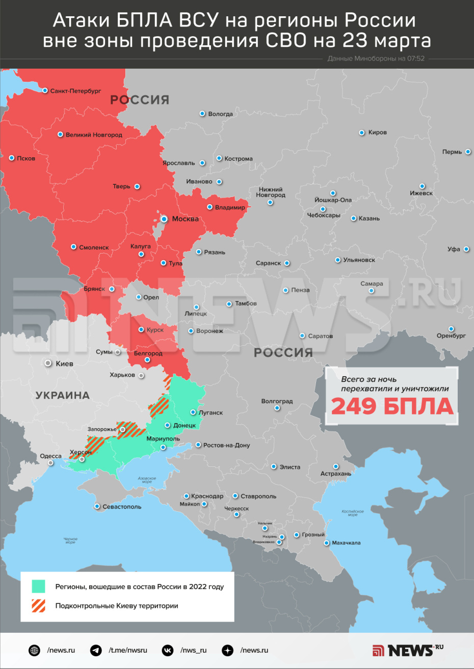 Утром 18 марта пресс-служба Минобороны РФ проинформировала, что силы ПВО за ночь ликвидировали и перехватили 138 украинских беспилотников над регионами России. По данным ведомства, 40 БПЛА и 35 дронов сбили над территориями Краснодарского края и Республики Крым.