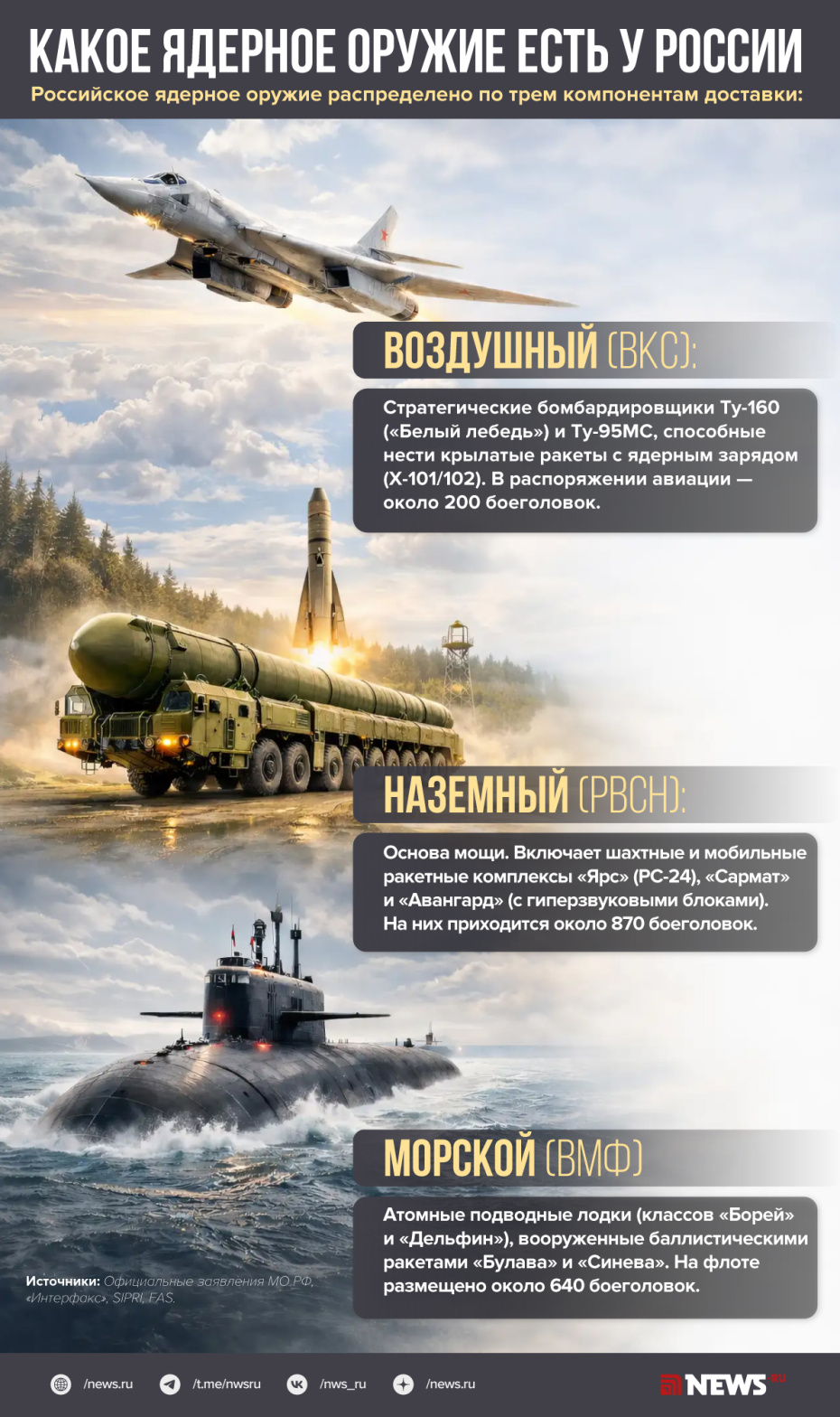 Согласно данным журнала «Бюллетень ученых-атомщиков», Россия на 2025 год располагала 4309 ядерными боеголовками для своих стратегических и нестратегических ядерных сил. При этом из них развернуто приблизительно 1718 боеголовок: около 870 — на баллистических ракетах наземного базирования, около 640 — на баллистических ракетах подводных лодок и, предположительно, более 200 — на базах тяжелых бомбардировщиков. Утверждается, что еще 1114 стратегических боеголовок находятся на хранении вместе с 1477 нестратегическими.