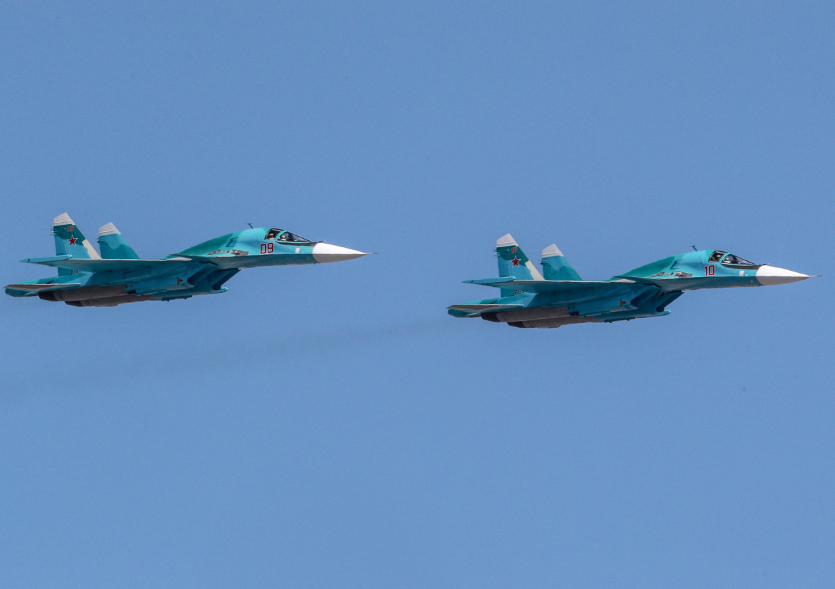 Министерство обороны России обнародовало видеозапись уничтожения украинской военной техники истребителями-бомбардировщиками Су-34. На ролике, опубликованном РИА Новости, показан взлёт самолётов с ВПП, затем демонстрируется поражение грузовиков украинских войск.