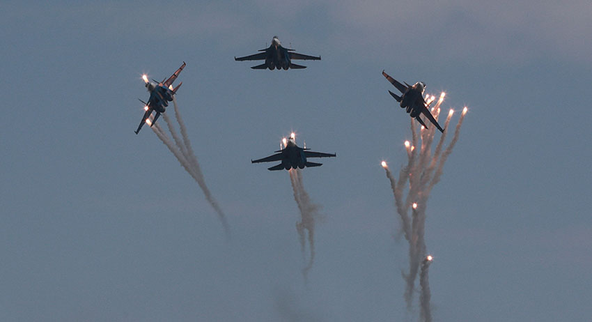 Лётчики пилотажной группы ВКС «Русские Витязи» на тяжёлых истребителях Су-30СМ отработали фигуры высшего пилотажа в подмосковной Кубинке. Пилоты продемонстрировали также совершенно новую фигуру — роспуск «большим цветком».
