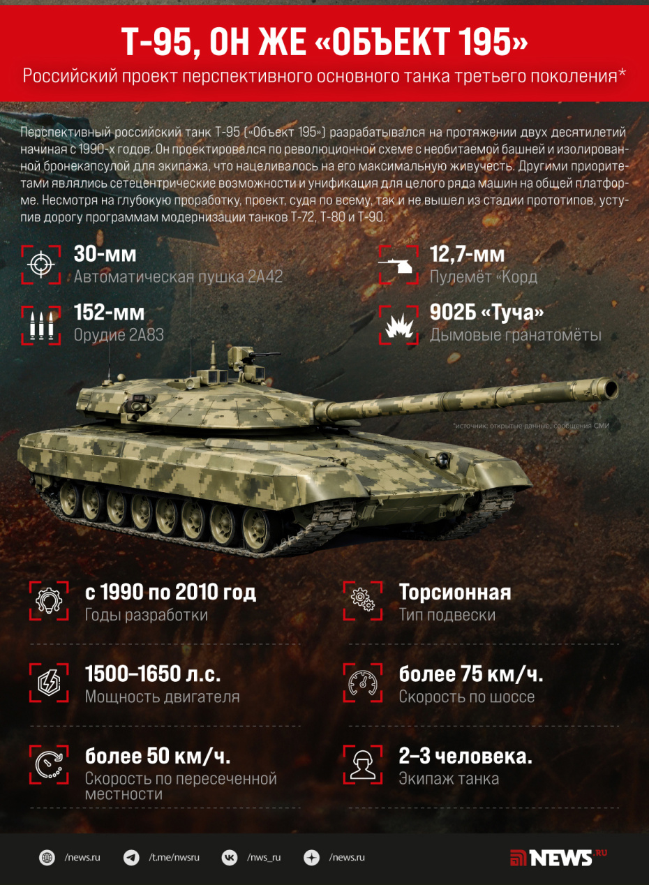 «Технические чертежи советского танка „Объект 195“ (Т-95. — NEWS.ru) пролили свет на смелую программу, призванную сохранить и упрочить преимущество страны в области качественной бронетехники в XXI веке», — пишет издание.