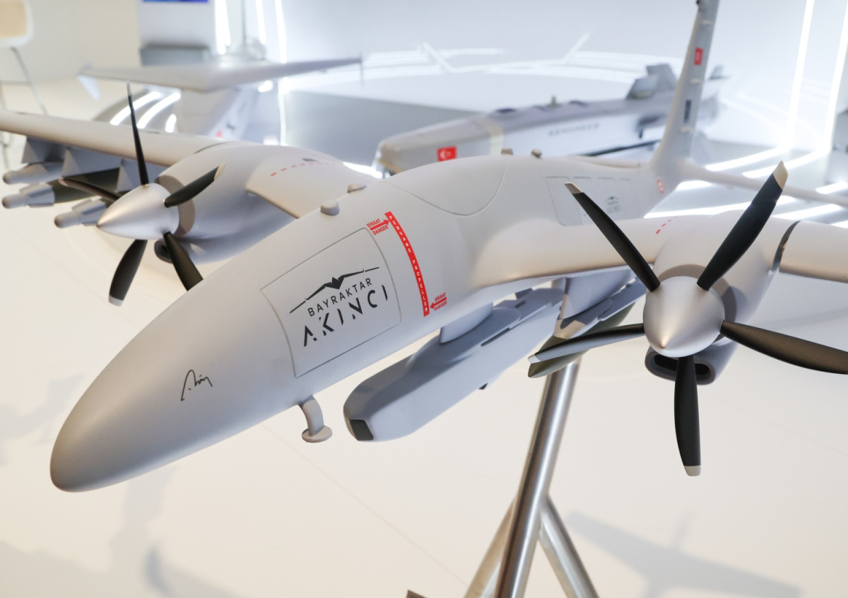 Ударный беспилотник Bayraktar Akıncı представлен на V Азербайджанской международной оборонной выставке ADEX 2024 в Баку, передает корреспондент NEWS.ru. Дрон имеет два турбовинтовых двигателя мощностью по 450 л. с. в секунду и взлетную массу 5,5 тонны.