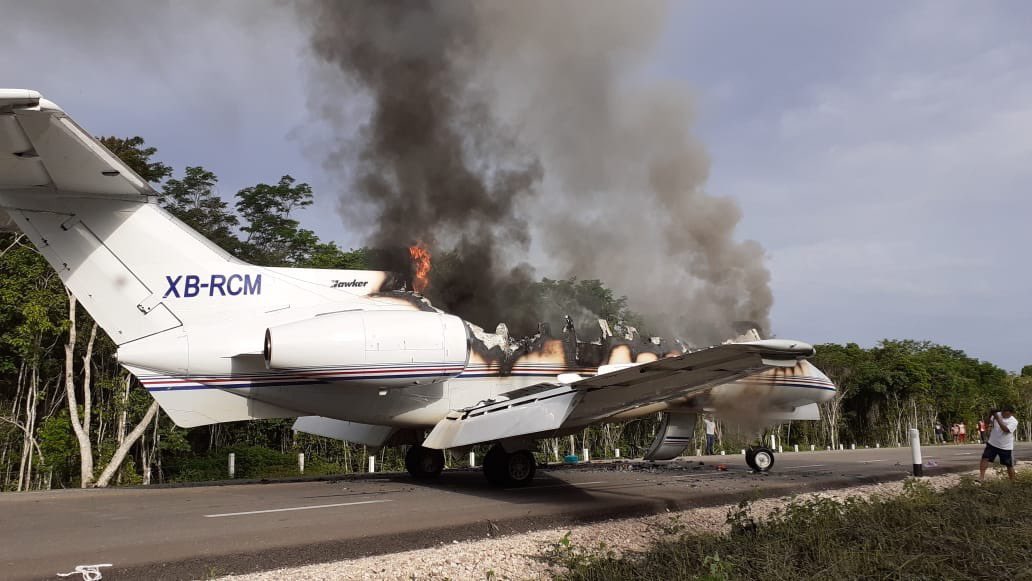 Далее показания свидетелей разнятся. По словам одних, воздушное судно задымилось от попаданий, после чего вынужденно приземлилось на 61-м километре шоссе Чунхухуб — Хосе Мария Морелос. Другие утверждают, что Hawker XB-RCM плавно сел на магистраль, а подожгли его сами пилоты. Уцелевший экипаж пытался скрыться от силовиков в лесу.