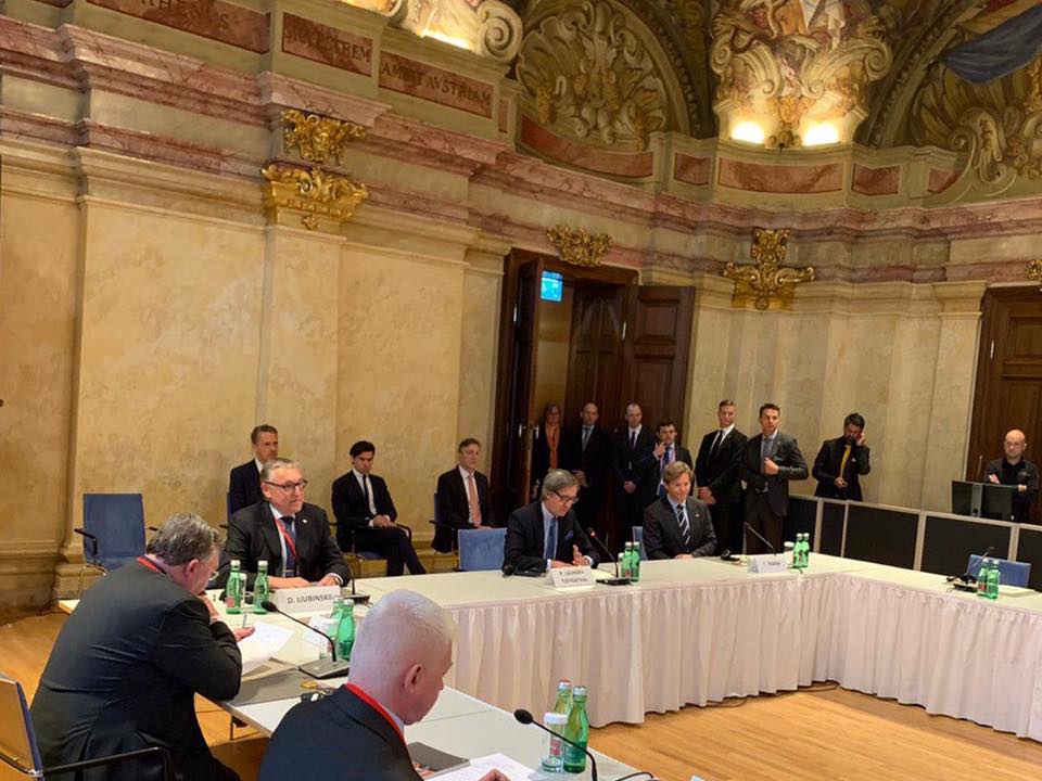 На снимке Любинского нет никаких китайских флагов, но помещение и столы те же. При этом перед участниками переговоров стоят только таблички и бутылки с водой.