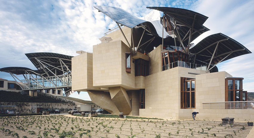 Комплекс спроектирован Фрэнком Гери, одним из самых именитых мировых архитекторов и лауреатом Притцкеровской премии. Его волнистые металлические структуры окрашены в несколько цветов: символизирующий красное вино розовый, имитирующий сетку на бутылках вина Riscal золотой и отсылающий к капсуле на пробке серебряный. Гости могут насладиться лучшими образцами вин и гастрономии.