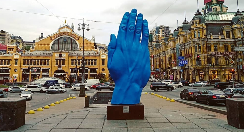 Арт-объект в виде гигантской синей руки появился в центре Киева. Скульптуру установили на постамент у Бессарабского рынка, где ранее располагался памятник Владимиру Ленину, демонтированный в рамках закона о декоммунизации.
