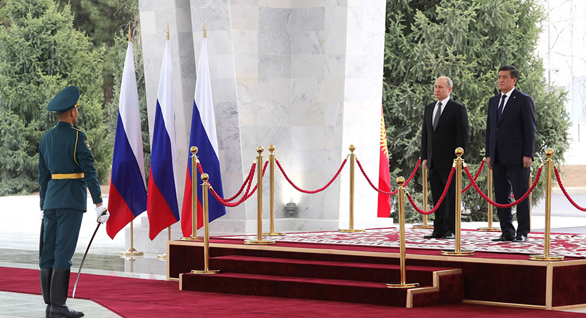 28 марта президент России совершил государственный визит в республику и провёл переговоры со своим коллегой Сооронбаем Жээнбековым. В отличие от встреч с лидером Белоруссии Александром Лукашенко, содержание которых традиционно не раскрывается, переговоры с Жээнбековым отмечены большим количеством подписанных и опубликованных документов, выдержанных в достаточно дружелюбной манере (не говоря уже о подарках Владимиру Путину в начале визита — коня породы орловский скакун и щенка киргизской борзой). Так, текст совместного заявления глав государств изобилует описанием успехов в развитии двусторонних отношений. В документе отмечается, что сотрудничество стран идёт практически во всех направлениях, начиная от торговли в рамках ЕАЭС и военно-технического сектора и заканчивая гуманитарной сферой. При этом даётся положительная оценка работы руководителей разных уровней, способствующих укреплению дружбы и взаимопонимания.