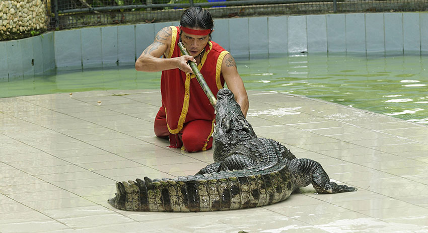 Во время представления одно из пресмыкающихся едва не откусило руку дрессировщику. 45-летний мужчина по имени Дао решил показать смертельный трюк — он положил руку в пасть крокодилу, но в какой-то момент хищник просто сомкнул челюсти. Дрессировщик не ожидал такого поворота событий, однако все же смог каким-то чудесным образом выдернуть конечность из пасти рептилии и удалился со сцены.