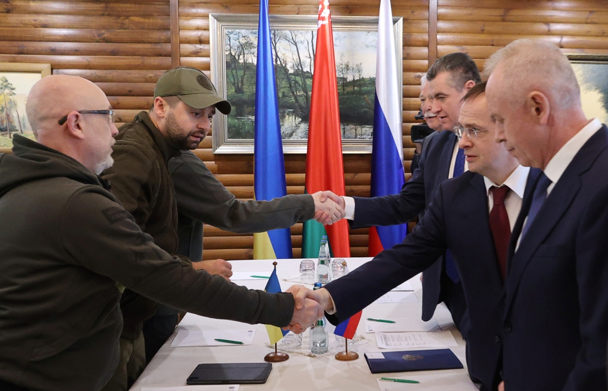 Второй раунд переговоров России и Украины о прекращении боевых действий проходил в Беловежской Пуще. Украинская сторона прибыла туда на вертолётах. Российская делегация явилась на встречу несколько раньше и ожидала коллег с Украины в комнате для переговоров. Когда те зашли в помещение, стороны пожали друг другу руки.