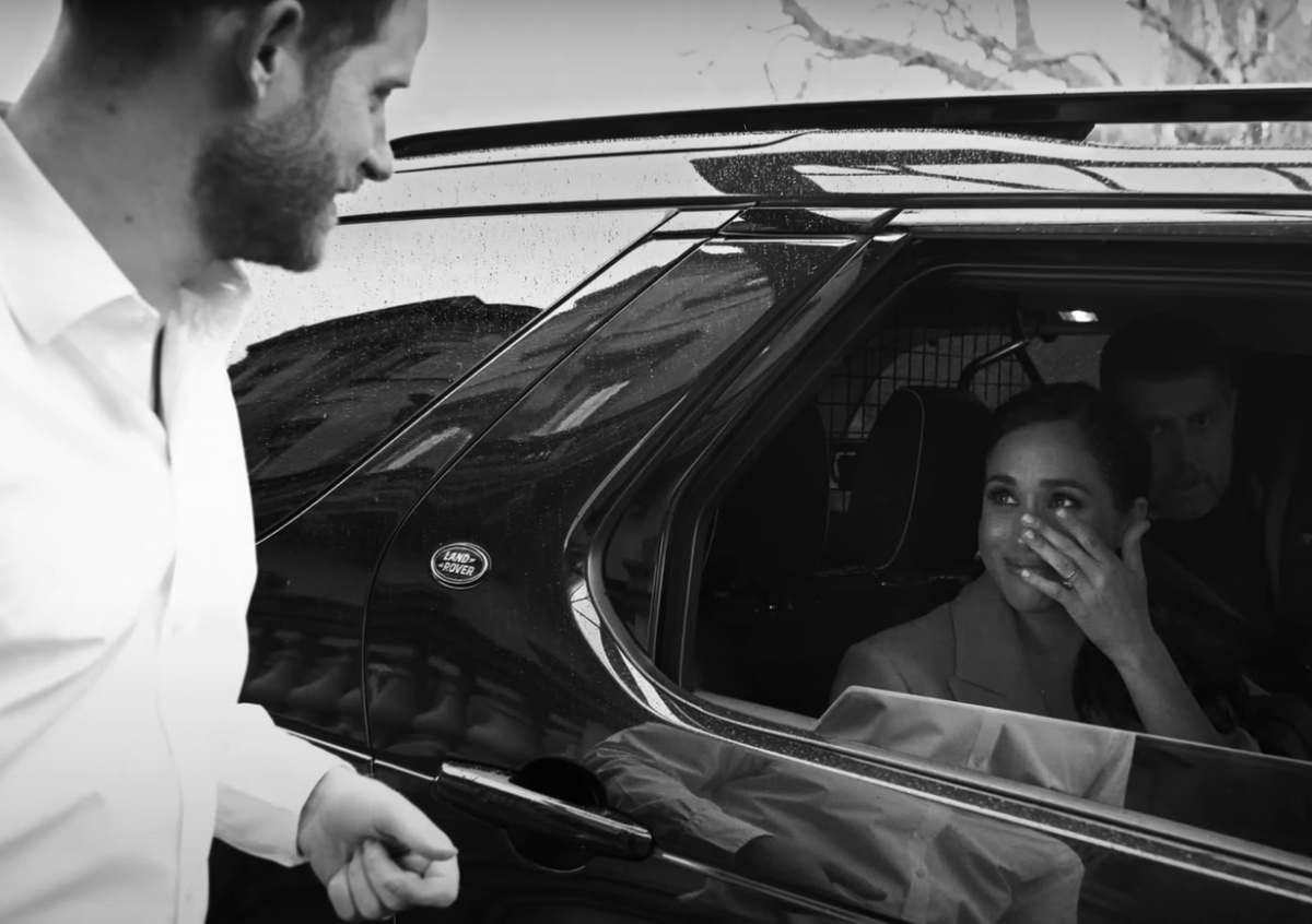 На экране мелькают картинки, запечатлевшие моменты из жизни пары, и не только счастливые. На одной из них Меган сидит в кресле, закрыв лицо руками, на другой — рыдает на плече мужа. Есть и намеки на обидчиков: камера вдруг выхватывает крупным планом Уильяма и Кейт с мрачным, даже злобным выражением лица. На самом деле фото сделано на похоронах королевы, где всем было не до веселья. Но зритель может подумать, будто взгляд исподлобья адресован невестке.
