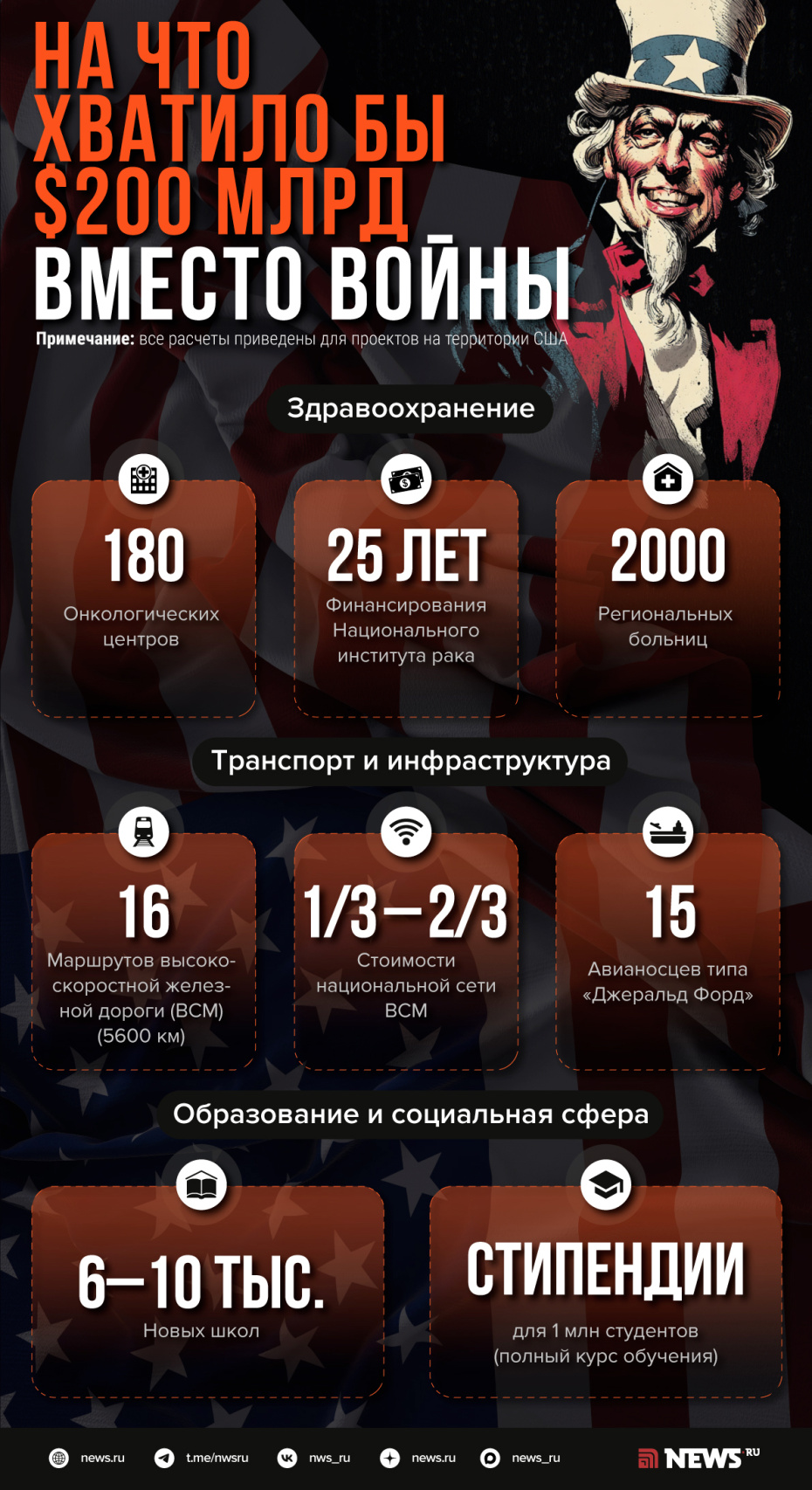 Пентагон запросил у конгресса $200 млрд на военную операцию против Ирана. Это на $67 млрд больше суммы, которая требовалась Джорджу Бушу — младшему на вторжение в Ирак. Несколько недель воздушно-морской кампании обходятся американским налогоплательщикам дороже, чем год полномасштабной иракской войны. О том, что можно было бы построить, создать или профинансировать на эти средства в мирных целях — в материале NEWS.ru.