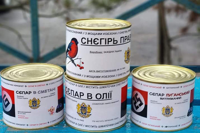Производством мясных консервов и соусов занялись ветераны АТО (антитеррористической операции — так официальный Киев называет боевые действия на территории Донецкой и Луганской областей Украины). Полуфабрикаты выпускаются под названиями «Сепар в сметане», «Снегирь православный», «Сепар луганский». Название для соуса звучит так: «Смерть врагам». Фото продукции в Facebook выкладывает Александр Грамарчук, ветеран АТО.