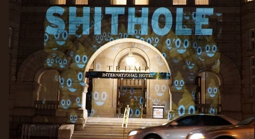 Вход в отель американского президента Дональда Трампа «украсила» световая проекция «shithole», что в переводе с английского означает «вонючая дыра» или «гадюшник». Об этом написал в Twitter основатель Bell Visuals Робин Бэлл, а заодно и выложил видео, как выглядит отель с надписью. Ранее Роберт Бэлл уже делал подобные проекции, критикующие политику Трампа.