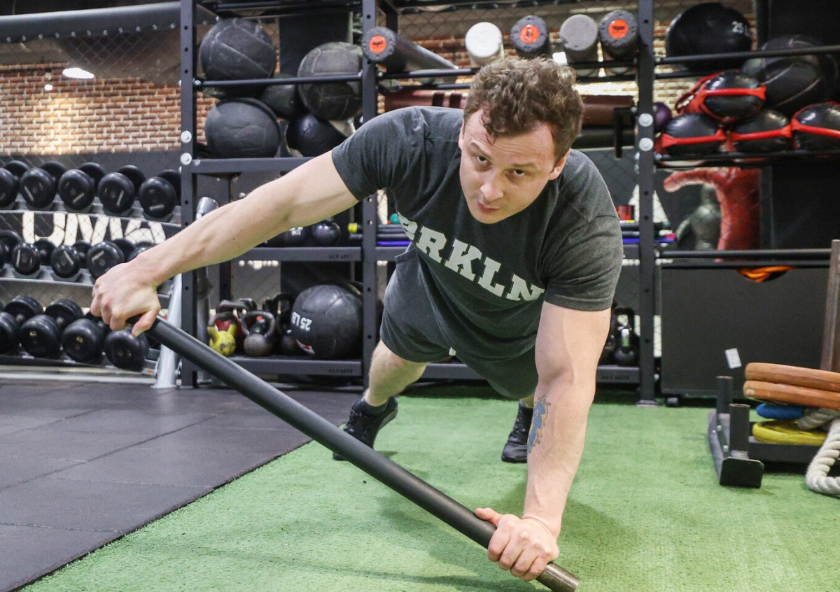 Планка с постукиваниями по плечам — обязательная часть тренировки, подчеркнул Болмеер. Он объяснил, что нужно упереться предплечьями в пол, при этом локти находятся под плечами, а тело образует прямую линию от головы до пяток. Далее нужно напрячь корпус и постучать по одному плечу противоположной рукой, затем вернуться в исходное положение планки. И повторить упражнение нужное количество раз, чередуя стороны.