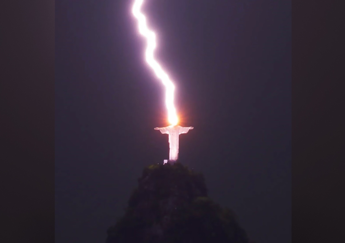 Опубликованы кадры попадания молнии в голову статуи Христа в Рио-де-Жанейро
