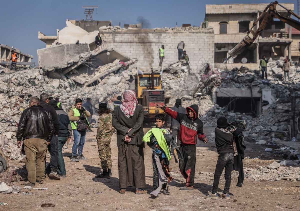 Сирия, Джиндирес: люди стоят рядом с разрушенным зданием во время восстановительных работ после смертоносного землетрясения, обрушившегося на Турцию и Сирию Сирия, Джиндирес: люди стоят рядом с разрушенным зданием во время восстановительных работ после смертоносного землетрясения, обрушившегося на Турцию и Сирию Фото: Anas Alkharboutli/dpa/Global Look Press