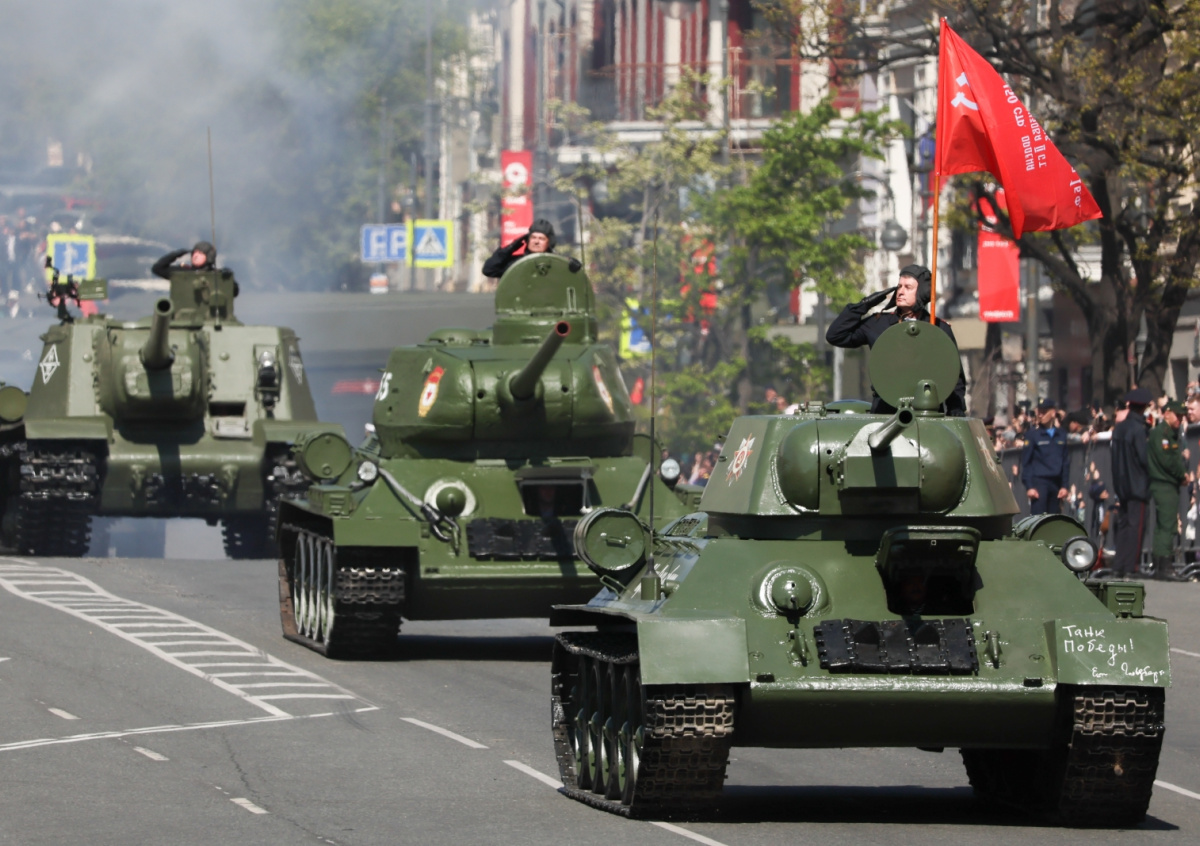 Владивосток. Танки Т-34-76 и Т-34-85 во время парада, посвященного 78-й годовщине победы в Великой Отечественной войне