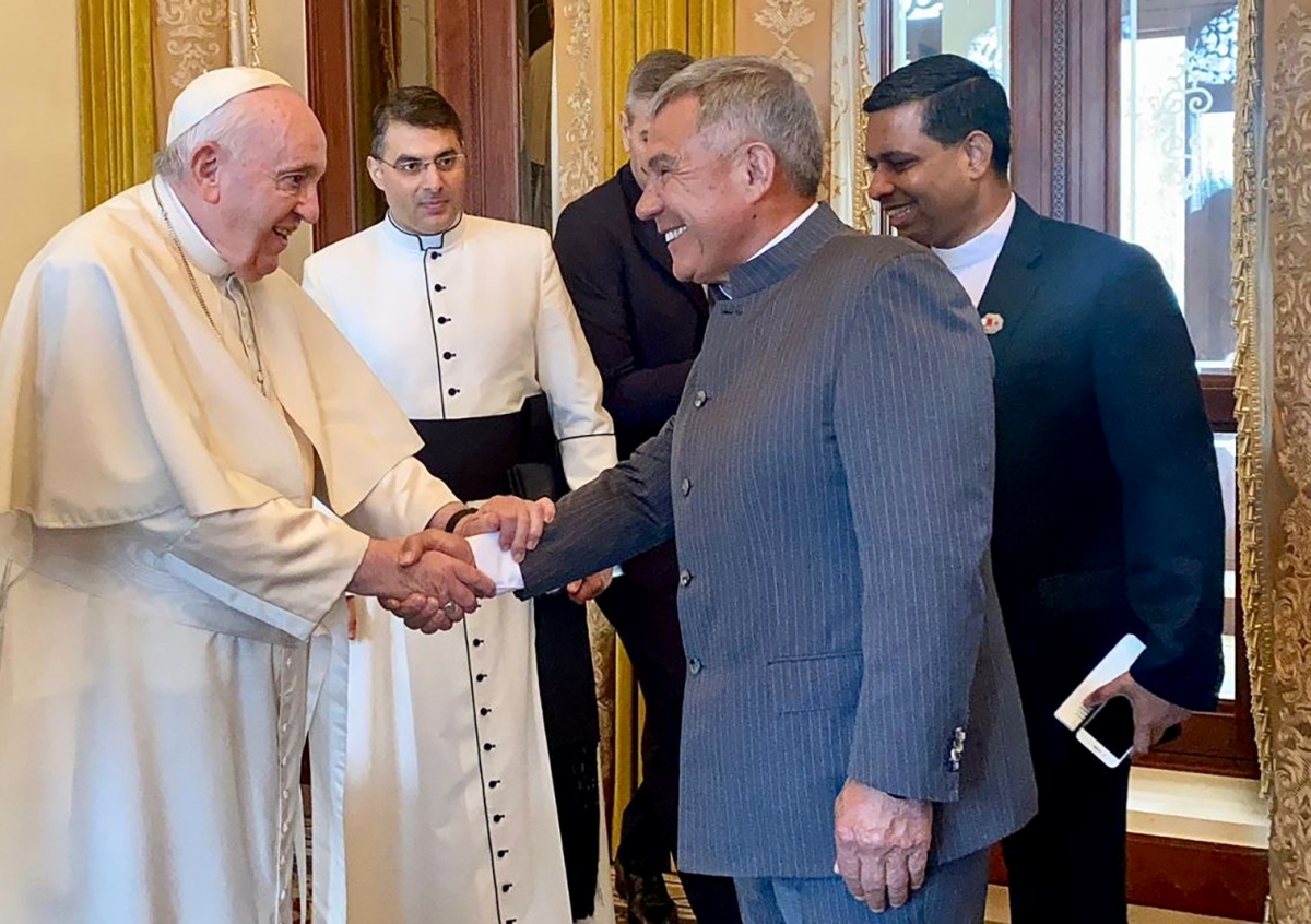 Президент Татарстана Рустам Минниханов встретился с папой римским Франциском на полях Бахрейнского форума в Манаме, о чем поделился в своем Telegram-канале. По его словам, он донес до понтифика мысль о том, что в России на протяжении многих веков представители разных культур и конфессий живут в мире и согласии.