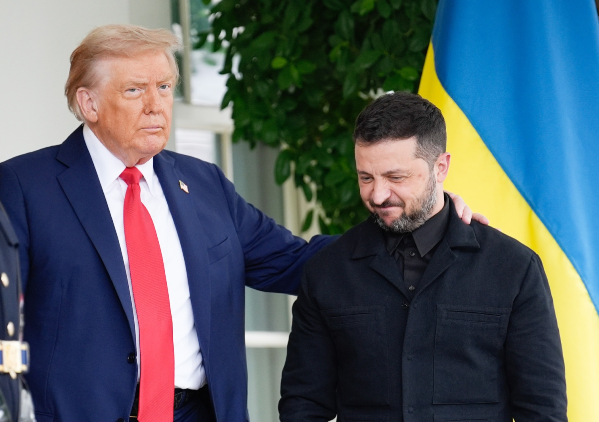 Владимир Зеленский во время встречи в Восточной комнате Белого дома. На дальнем плане слева направо: премьер-министр Великобритании Кир Стармер, президент Франции Эмманюэль Макрон и президент США Дональд Трамп